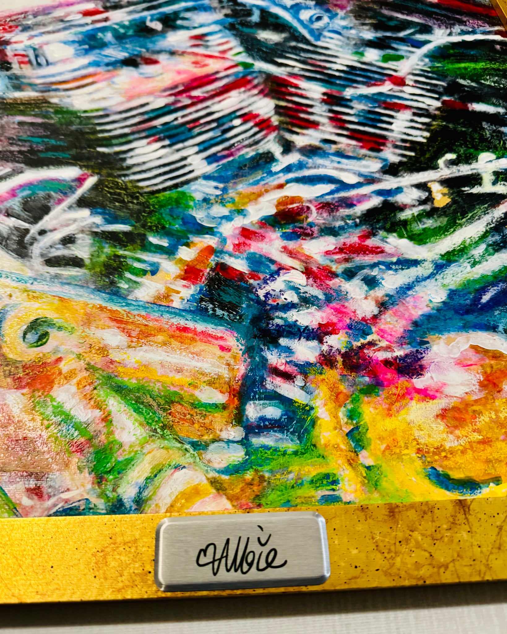 Intricately and intimately crafted with paint, metallic leafing, markers and other materials. Finished in a frame.
