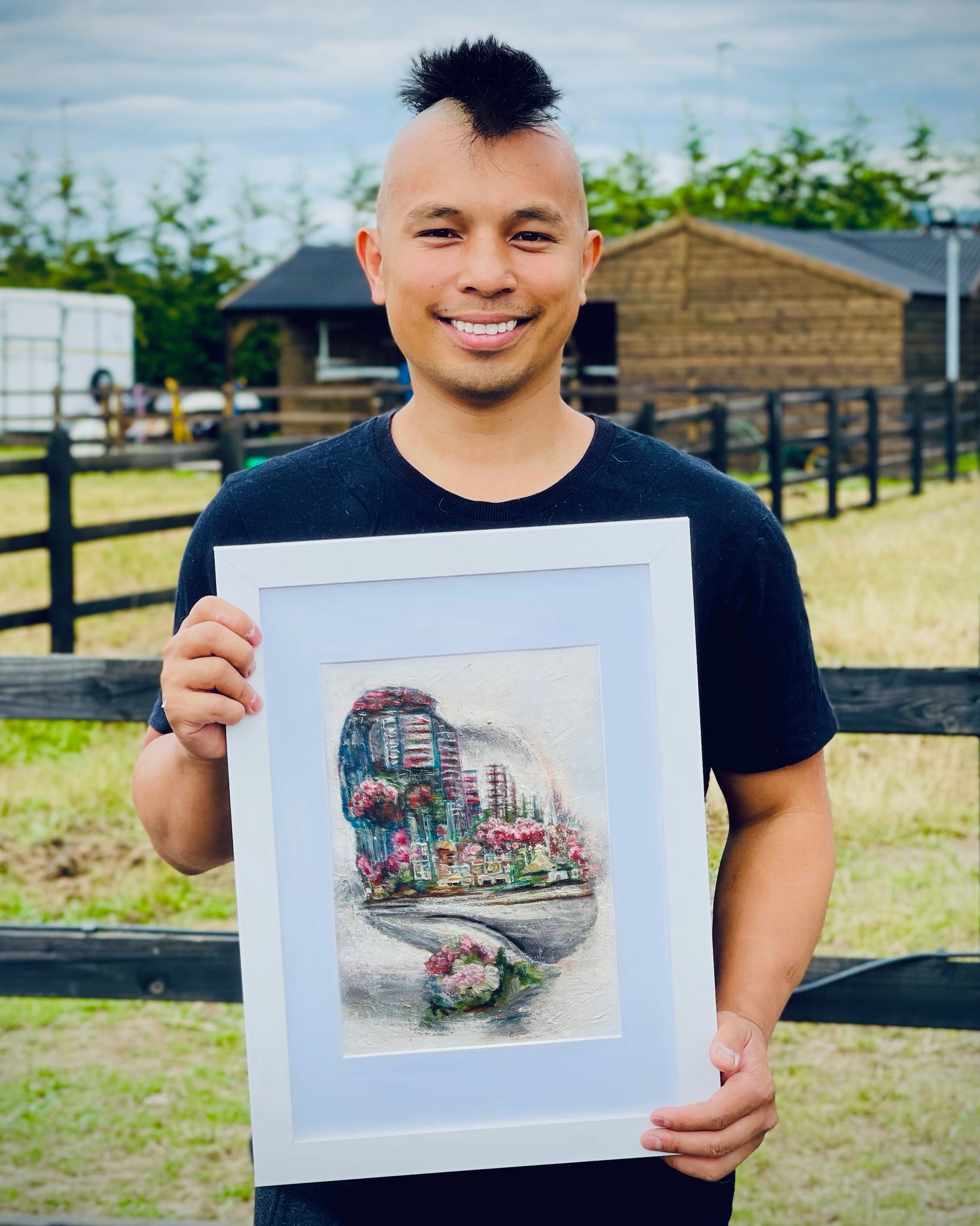 The size of the art is 21 x 30 cm or 8.3 x 11.7 in, but comes in a large white frame.